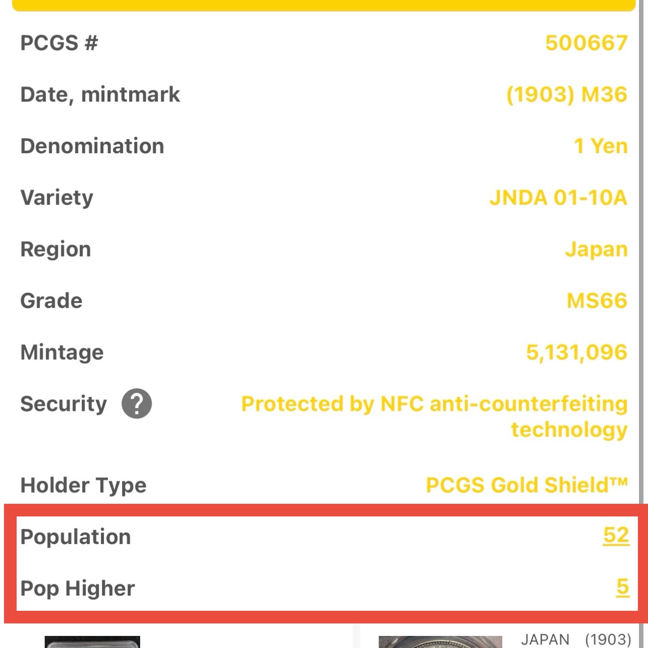 Detail | ●An exceptional high-grade example of Japan’s late Meiji silver yen, struck in 1903 (Meiji 36) — one of the later issues of Japan’s iconic “Dragon Yen” series.Certified PCGS MS-66, this specimen exhibits superb mint luster and near-flawless surfaces, with finely detailed scales on the dragon and sharply rendered legends. It stands as a testament to the Osaka Mint’s precision and craftsmanship during Japan’s industrial and monetary modernization. ●PCGS Population According to the latest PCGS census, only 52 coins have been certified at the MS-66 level, with merely 5 graded higher, underscoring the extreme scarcity of top-condition examples. (See population chart above.)