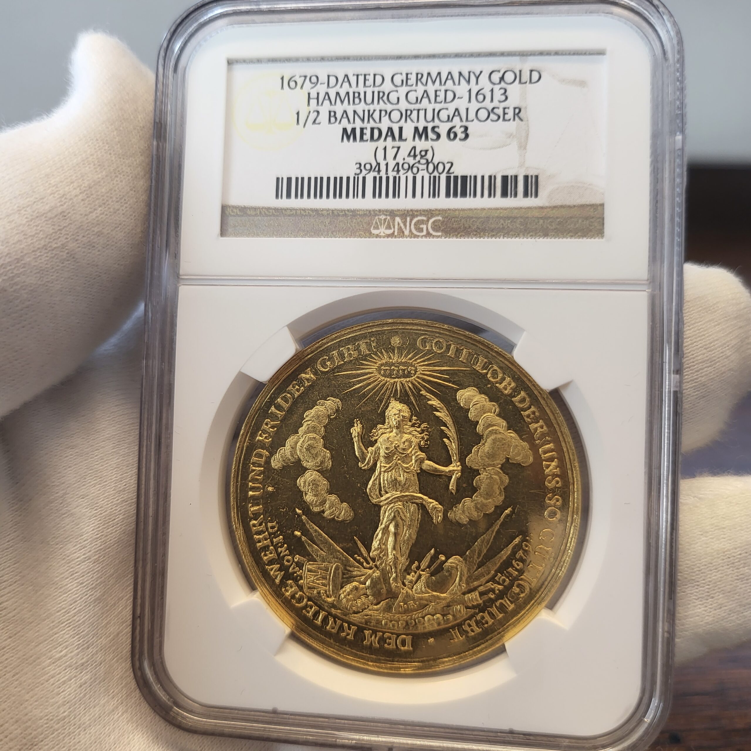 | 詳細 | ●神聖ローマ帝国1/2 バンクポルトガレッサー。 ポルトガレッサーは貨幣の単位で1ポルトガレッサーは10ダカット(34.8g)です。(1ダカット=3.48g) 従い、1/2 バンクポルトガレッサーは5ダカットになります。 ポルトガレッサーには『プライベートポルトガレッサー』と『バンクポルトガレッサー』の二種類があります。『バンクポルトガレッサー』の方が遥かに希少です! ルネッサンス・デザインの傑作金貨!! |